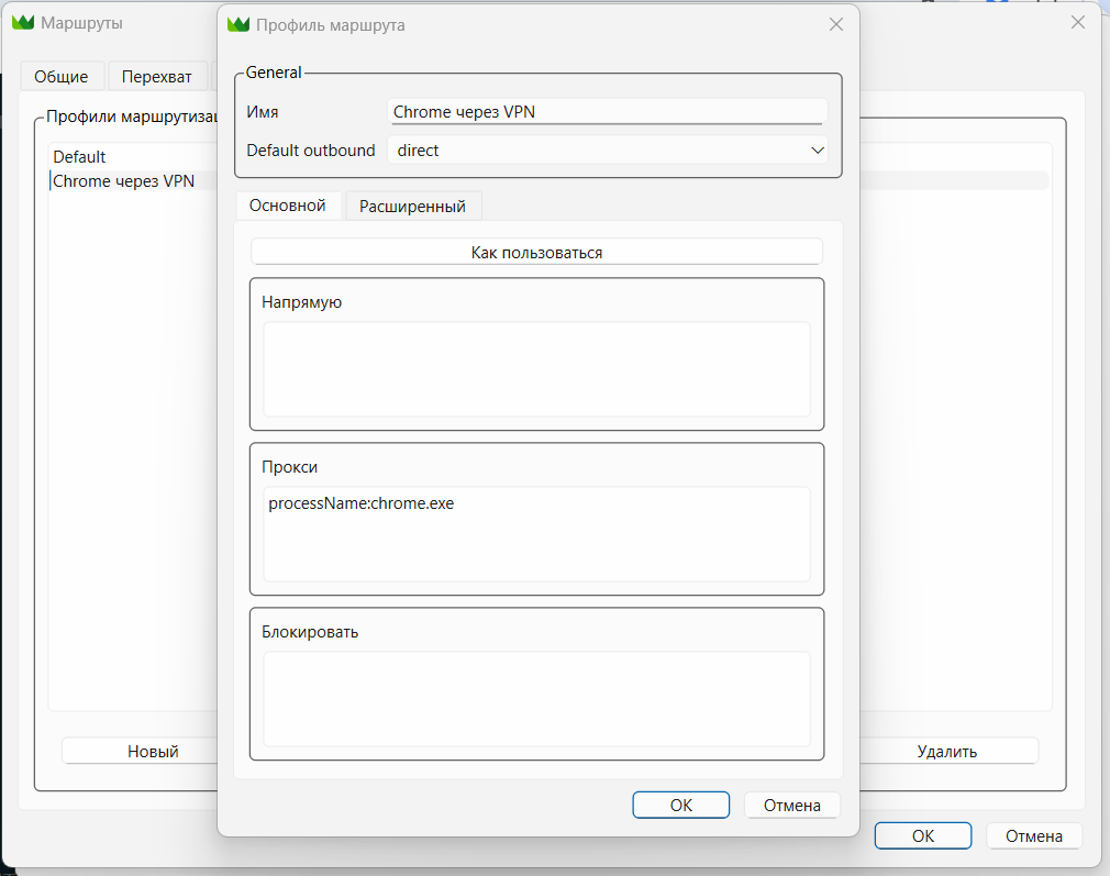 Например, правило для браузера Chrome через VPN, остальное напрямую: